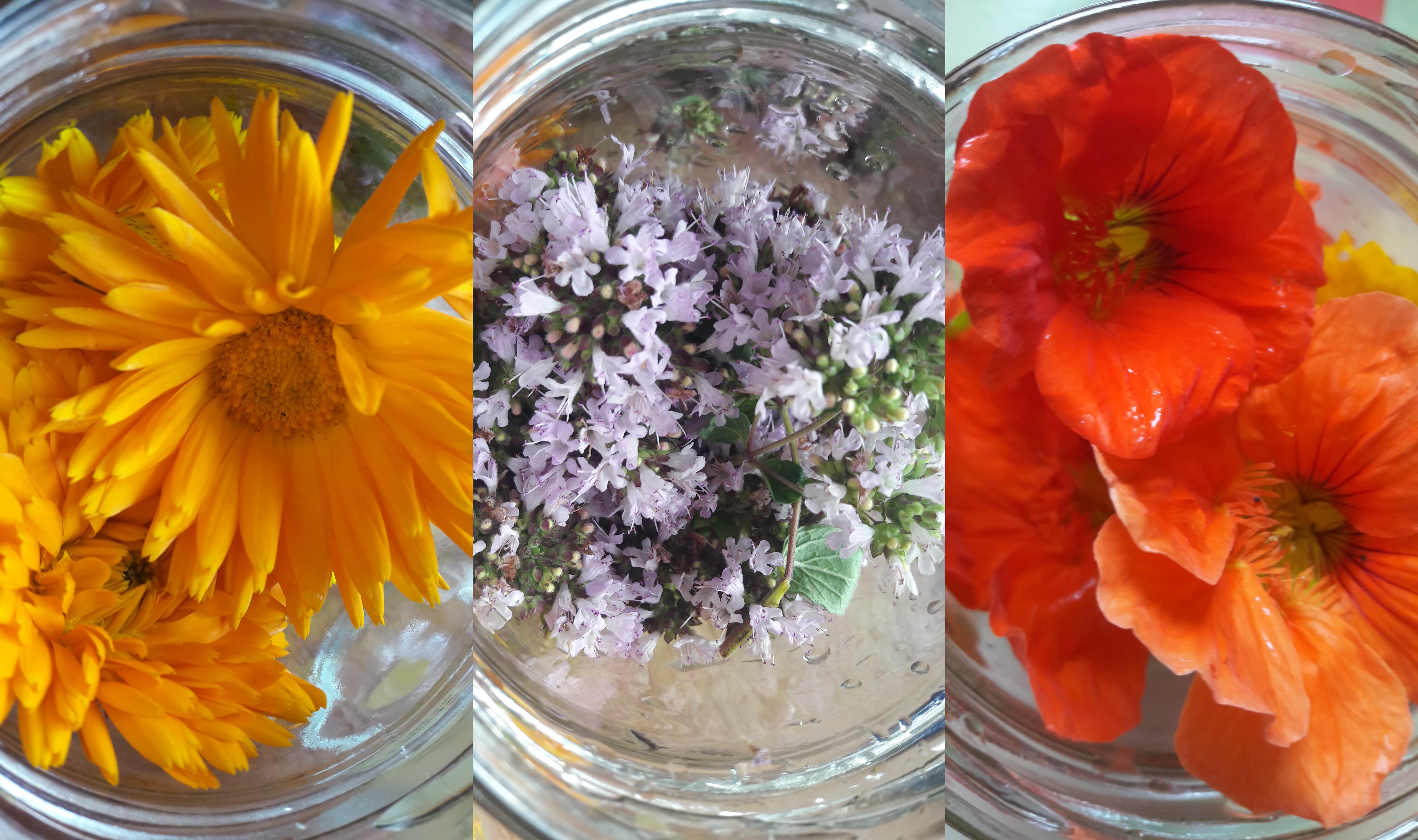 Wiele kwiatów z naszych ogrodów jest jadalnych. Można dodawać je do sałatek, zup, ciast itp. Aby zachować ich cenne właściwości, można je ususzyć, zalać alkoholem, zasypać cukrem lub zrobić macerat octowy. Drogocenne właściwości kwiatów i ziół zostają w ten sposób przeniesione do octu i razem z nim wędrują do naszej sałatki. Dziś znalazłam zeszłoroczny zapas octu jabłkowego. Część wykorzystałam do marynat, a część do maceratów. To kwiaty nagietka, oregano i nasturcji.