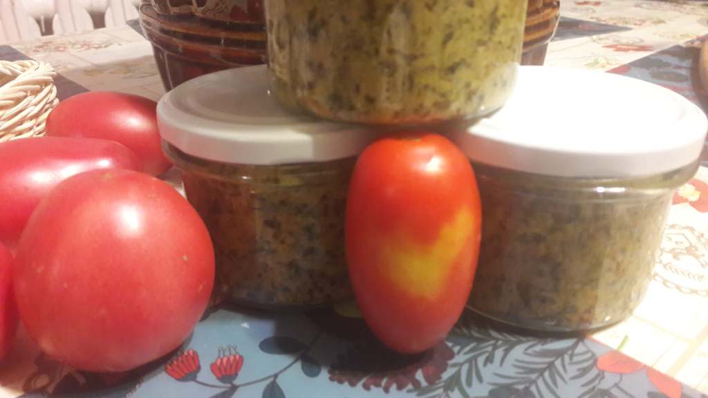 Jarmuż, cebulę i czosnek pokroiłam. Na patelni rozpuściłam ok. 3 łyżki masła, wrzuciłam cebulę, czosnek i jarmuż, dodałam pieprz i sól, i dusiłam do miękkości. Pomidory sparzyłam i obrałam ze skórki, dodałam do warzyw na patelni. Pod koniec duszenia dodałam 1/2 łyżeczki imbiru w proszku (wolę świeży, ale akurat nie miałam) i 7 łyżek kaszy jaglanej. Zblendowałam wszystko, podgrzałam pastę jeszcze raz na patelni i gorącą przełożyłam do słoiczków. Po wystygnięciu kilka dni można przechowywać w lodówce.