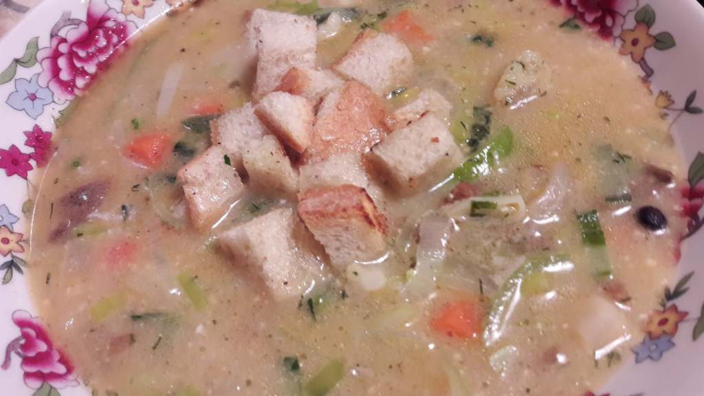 Umyłam i obrałam pora. Pokroiłam pora i jarmuż w paseczki i poddusiłam na maśle z solą, pieprzem i czosnkiem. Warzywa wrzuciłam na wrzątek, a kiedy były już miękkie dodałam do nich sos grzybowy i duszone pory. Doprawiłam wszystko do smaku śmietaną i serem. Na patelni szybciutko zrobiłam grzanki z czerstwego chleba.