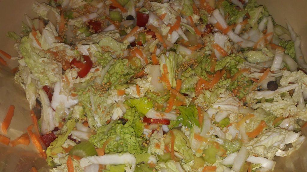 - Warzywa ucieramy/ kroimy/ szatkujemy, mieszamy, dodajemy sól i odstawiamy na ok. 1 godzinę żeby wypuściły sok. Wtedy przekładamy do garnka kamionkowego albo słoika. W razie potrzeby można dolać trochę osolonej wody, aby warzywa były przykryte.