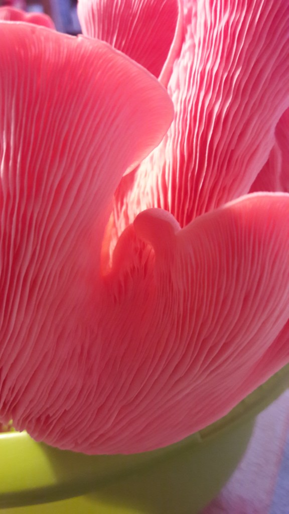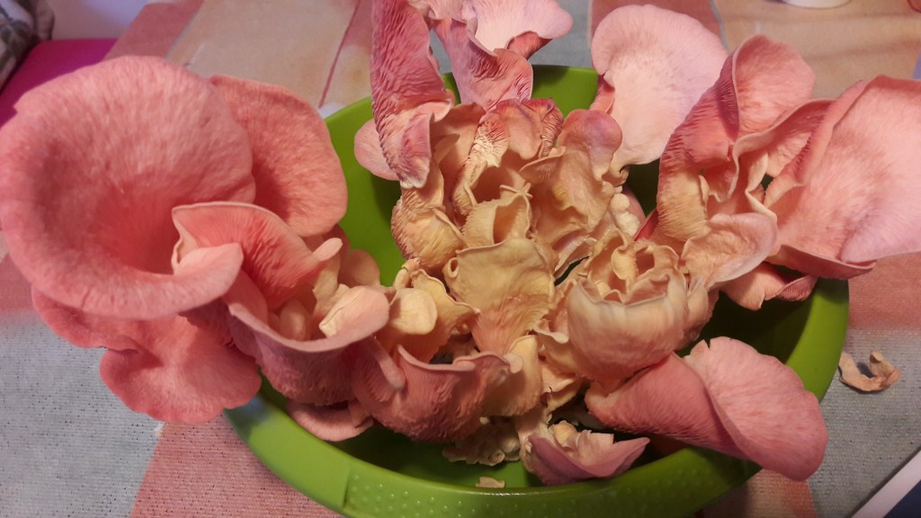 Trudno nam wytrzymać zimą w mieście bez ogrodu. Postanowiliśmy więc poeksperymentować z uprawą grzybów. Jeśli nas znacie, to wiecie dlaczego 😉 Na razie zebraliśmy pierwsze shitake i boczniaka różowego, o którym dzisiejszy wpis. Przez lata wmawiano nam, że grzyby są bezwartościowe i ciężkostrawne, obecnie wiadomo, że jest zupełnie odwrotnie. Co ciekawe, grzyby zawierają duże ilości witaminy D, zwłaszcza jeśli pozwolimy im poleżeć na słońcu. Co do boczniaków, do niedawna nie wiedziałam, że jest ich tyle gatunków i mają tak cudowne właściwości. W boczniakach różowych stwierdzono obecność polisacharydów, zwanych betaglukanami, te substancje wzmacniają nasz układ odpornościowy. Betaglukany mają także zdolność obniżania poziomu cholesterolu i glukozy we krwi, wykazują działanie przeciwwirusowe, przeciwbakteryjne i przeciwalergiczne. Grzyby te są odżywcze, zawierają łatwo przyswajalne białko, witaminy, mikroelementy, błonnik, są niskokaloryczne. Zawierają antyoksydanty. Jak ich nie kochać? Można je kochać za sam wygląd. Kiedy na nie popatrzymy, to już na pewno szkoda ich jeść. Cieszą oczy swoim kolorem i kształtem przypominając kwiat. Niestety nie ma co za długo się przyglądać ponieważ są to grzyby nietrwałe i to jest główny powód dlaczego nie znajdujemy ich w sklepach. W porównaniu do boczniaków ostrygowatych są delikatniejsze w smaku, pachną trochę inaczej, szybciej miękną. Wiosną będzie ich można u nas spróbować, serdecznie zapraszamy!