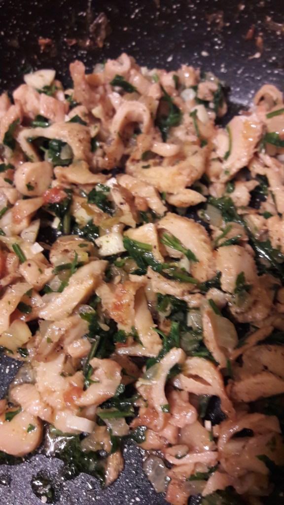 - Pokroiłam grzybki drobniutko i dusiłam na tłuszczu i wodzie. Kiedy były prawie miękkie dodałam cebulke pokrojoną w kostkę, czosnek i na sam koniec pietruszkę i poczekałam, aż woda zupełnie odparuje, a cebulka i grzyby lekko się podrumienią. Posoliłam i popieprzyłam do smaku i odstawiłam, aby lekko przestygły. Grzyby, cebula i pietruszka pięknie się dopełniają smakiem i aromatem. Właściwie już w takiej formie są gotowe do podania z makaronem. Włoskie potrawy nie lubią nadmiaru produktów.