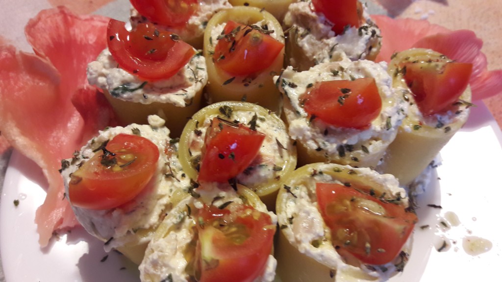 Koreczki makaronowe z pastą z kozim serem i boczniakami