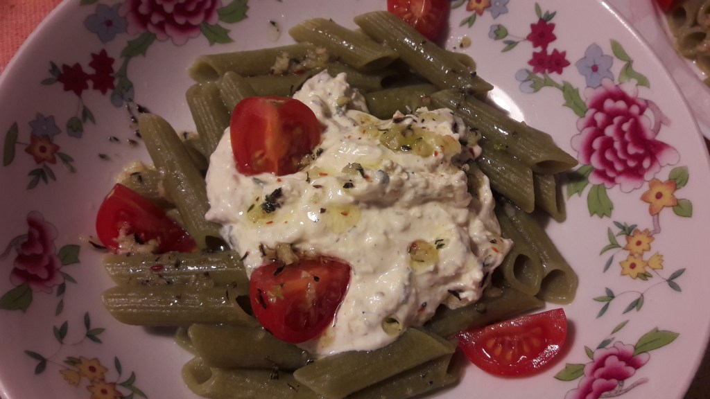 - Pokroiłam pomidorki i przygotowałam sos z oliwą, szczyptą soli sosnowej, tymiankiem i czosnkiem.